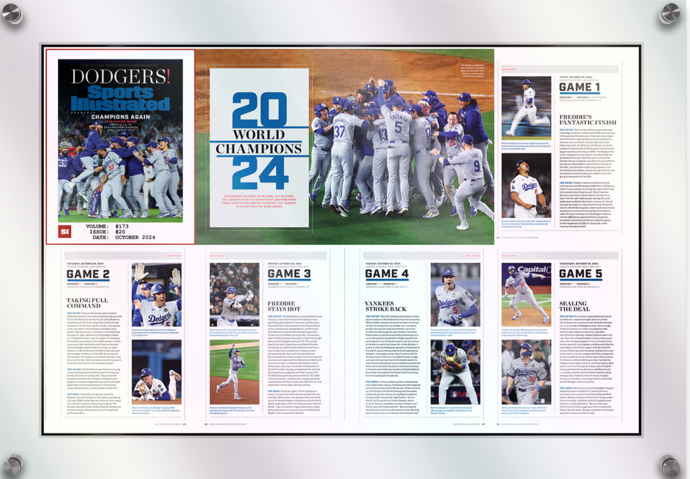 Celebrate the Los Angeles Dodgers’ unforgettable 2024 World Series triumph with this exclusive, Sports Illustrated™ commemorative piece. Capturing every thrilling moment from the Dodgers’ road to victory, this collectible encapsulates game-by-game highlights and iconic moments, cementing their legacy as champions.